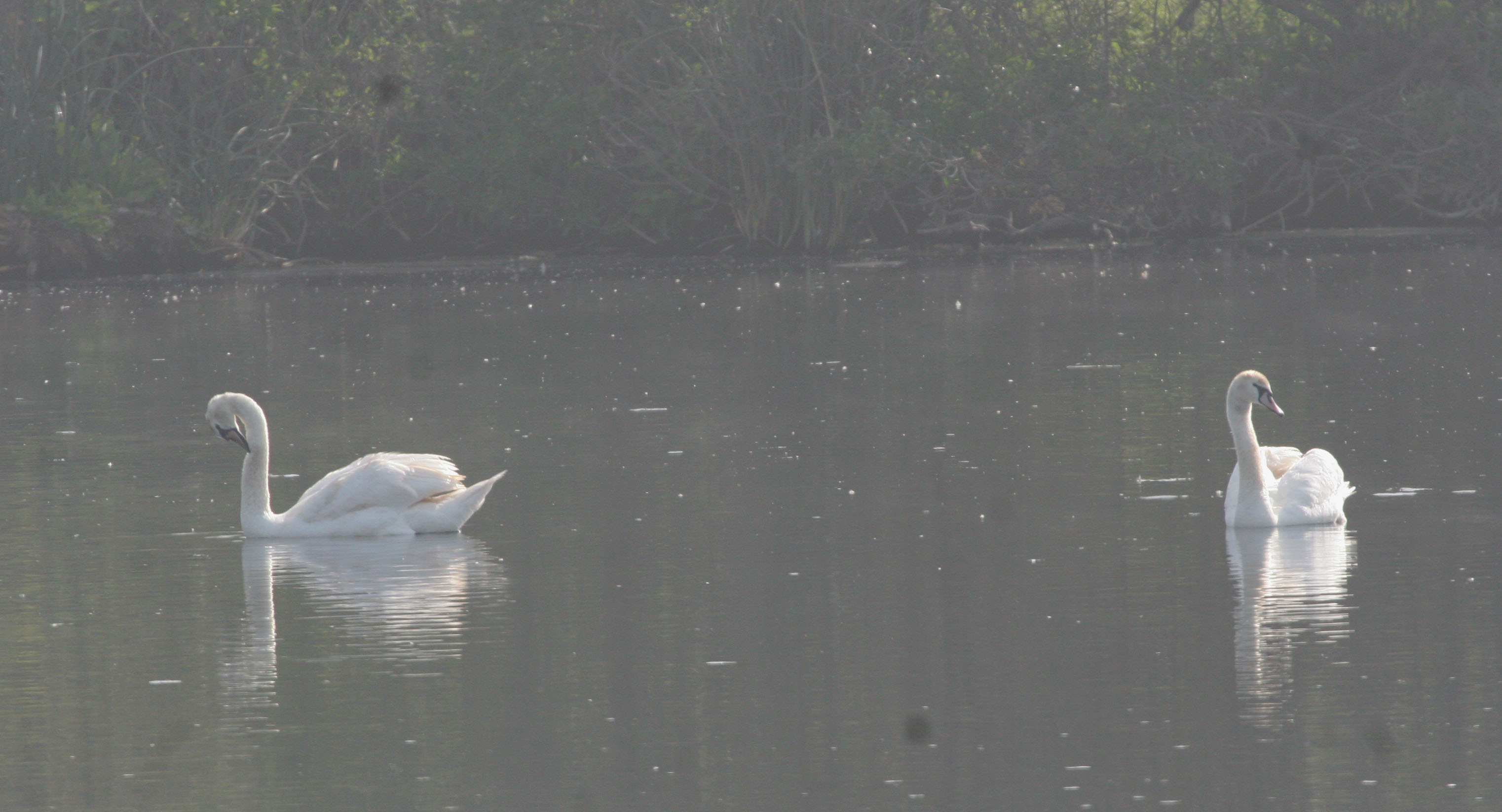 We were allowed into the enclosure through a small gate near the road where the first of many Song Sparrows was singing. As we wound our way along the edges of the ponds we caught quick looks at Common Yellowthroats and Bushtits in the mostly-non-native vegetation. By the time we left the first pond we had seen Cinnamon and Blue-winged Teals, American Wigeon, Mallard, Lesser Scaup, Ruddy Ducks, and two Mute Swans who flew in and glided to a stop in front of us.