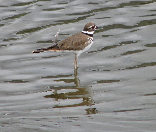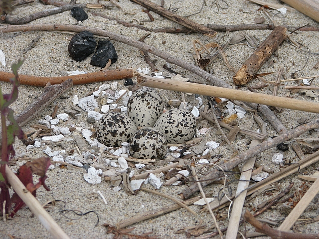 Out on the beach inland of the (now deserted) Snowy Plover enclosure, we startled a Killdeer, who proceeded to stagger and flop off with what appeared to be a broken wing. As most birders should know, this is a distraction display the adult puts on to lure a potential predator away from its nest. Lu quickly found the nest about 10 ft away from where we stood. I took a few pictures and then we dutifully followed the adult away so it could win this skirmish. Hopefully no crow or gull was paying attention and the nest remains safe among the sticks and pebbles.