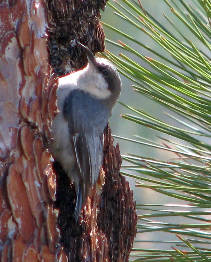 We also found Violet-green Swallows bringing food to their nest in a small hole in a large pine tree; the sharper hearing among us could hear the young in the nest peeping. A female Purple Finch was busily building a nest in a needle-tuft at the end of a low limb; I wonder how it will do when strong winds blow. Band-tailed Pigeons passed back and forth but never stopped. Mountain Chickadees were gathering food among the needles and on the ground, as were both Purple & Cassin’s Finches. Western Bluebirds were feeding their young.