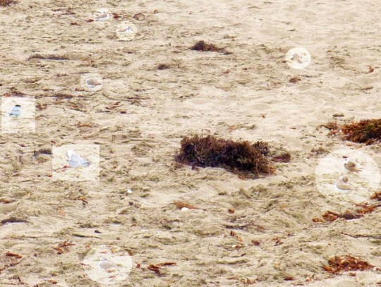 Almost nothing was on the sea, save a few Snowy Egrets staggering across the floating kelp, which always shocks those who haven’t witnessed this before. An odd-looking White-winged Scoter, uncommon here at any time of year, was diving in the surf zone. Next to the colony fence we found the dewatering system outlet pipe, the end of which was hanging over a large wooden framework full of boulders. The boulders are to dissipate the force of the discharged water so it doesn’t significantly erode the sand.