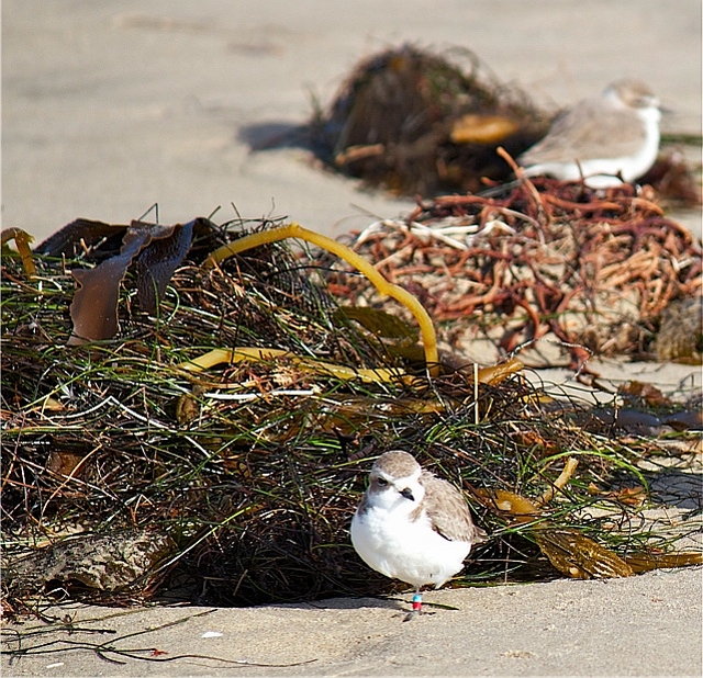 Snowy Plover PV:YB wasn’t seen among the flock of 61 roosting on the beach, waiting for the tide to begin dropping, but GG:AR and NO:WW were there. GG:AR (Left: green over green, Right: Aqua over Red) first appeared on Surfrider on 9/25/11 and was seen 11/25/12. NO:WW (Left: tan over orange, Right: white over white) appeared on 10/25/09 and recorded intermittently through 12/25/11.