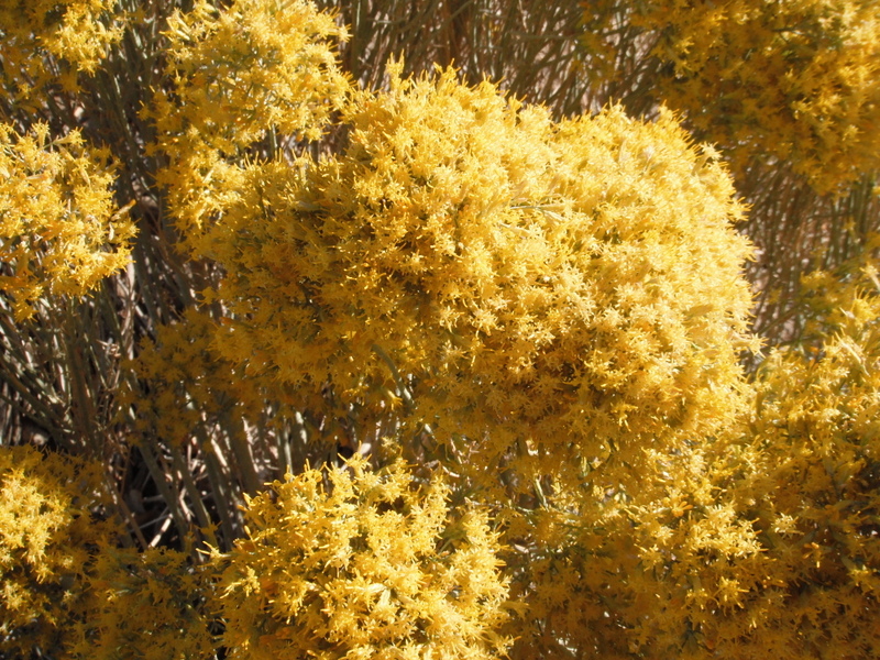 Regardless of these factors, our trip was beautiful. Glowing golden Rabbit Brush carpeted the slopes among Joshua Trees, apparently immune to drought. Gold and green highlighted the Cottonwoods, which harbored many cheeping Yellow-rumped Warblers, quite a few Ruby-crowned Kinglets, some Bushtits and, surprisingly, more than six Northern Flickers in the different locations we visited. Feathers under the trees suggested they had supplied prey for some raptor. Only one Rock Wren seen, three Bewick’s Wrens, one Mourning Dove, (no Eurasian Collared Doves –previously well established at Sageland). In balance, Chuck Bragg spotted a Blue-gray Gnatcatcher for us down at Butterbredt before leaving, and we did watch three Red-breasted Sapsuckers, seemingly squabbling, in the trees at Keith’s. Another great surprise were Lys’ catching the sounds of Cedar Waxwings, a large flock checking the mistletoe berries along with Western Bluebirds, in the big Cottonwood at the ranch. They did not stay long but had not been seen there for several years. Another pleasant surprise on our Sunday walk up Axelson Creek, was in fact the only bird found – a beautiful Hermit Thrush lurking in the undergrowth.