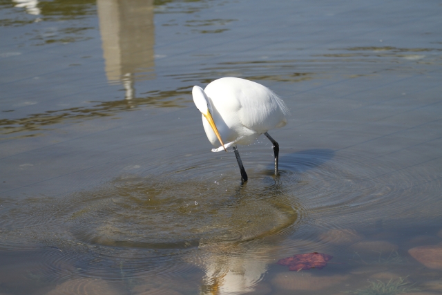 The Lagoon that is our monthly bird walk site seems to have fully recovered its attractiveness to various coastal bird species after a year’s restoration. Great Egrets, Snowy Egrets and Great Blue Herons were lined up on a bank, waiting for some of the ample supply of small fish to swim by. The numbers of birds were heartening also, with all areas of the lagoon well-populated and a gull flock that must have numbered over 2,000 a few hundred meters off Surfrider Beach’s first point. (This is not included in our count since we were unable to ascertain species.)