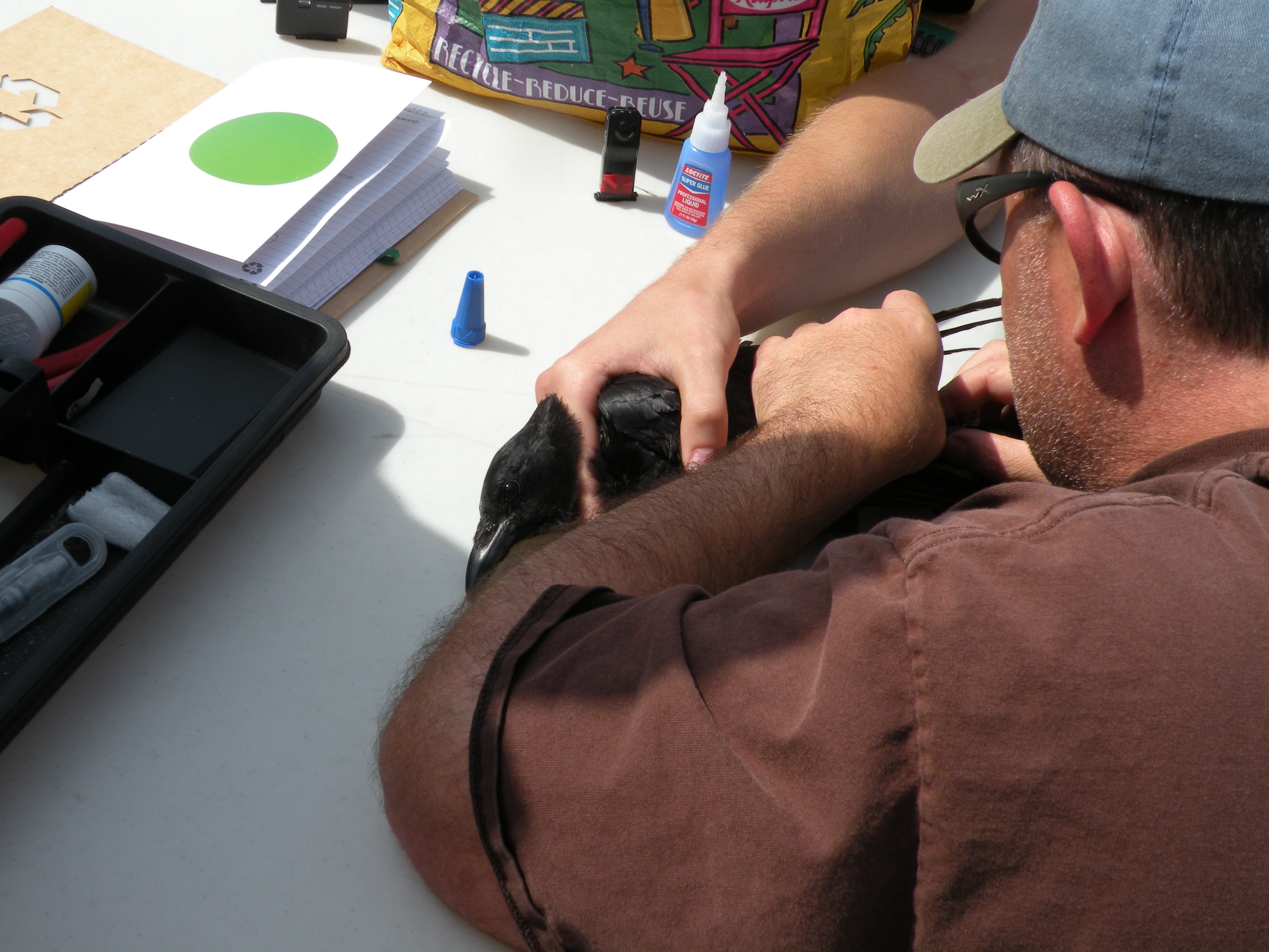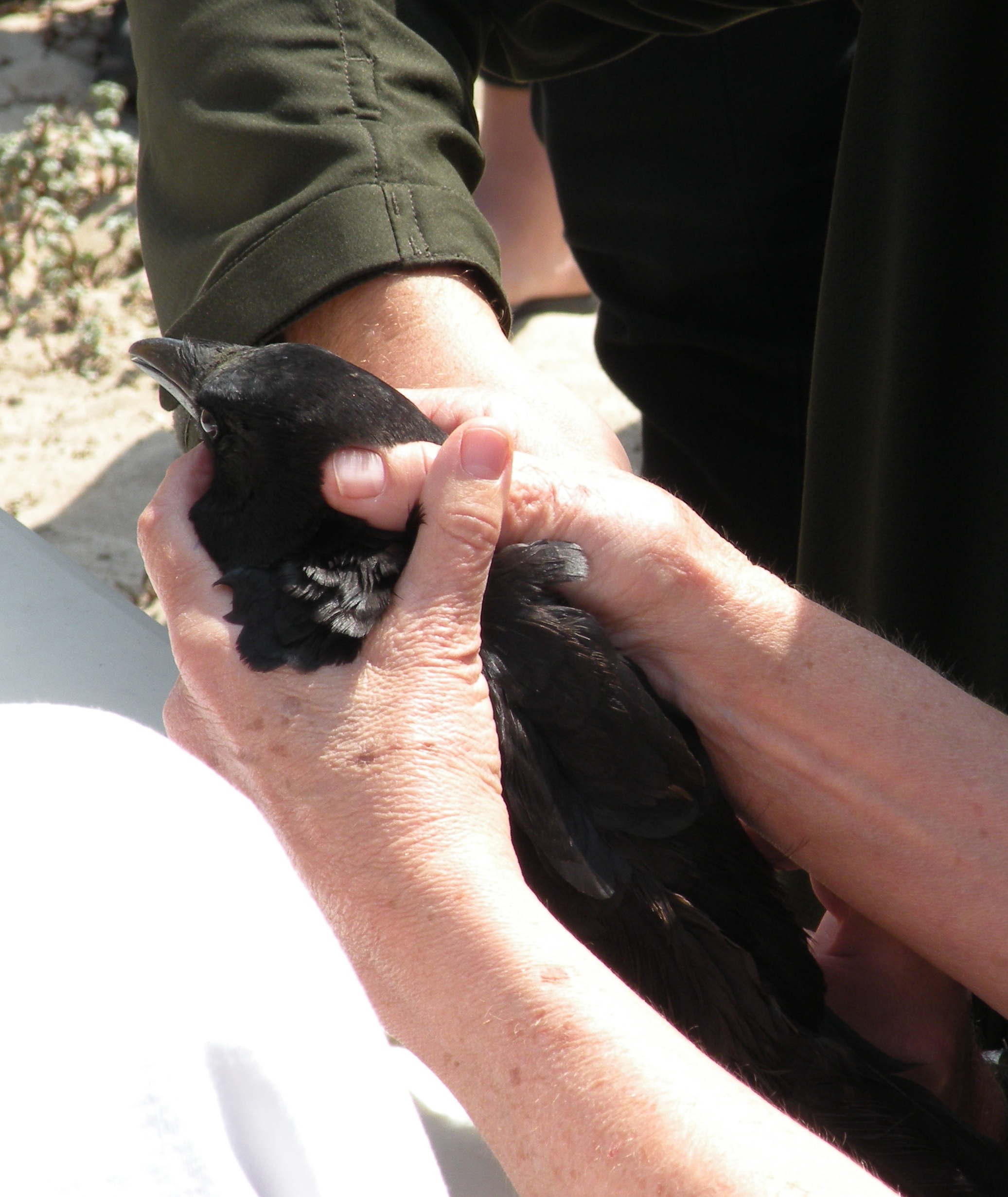 The nuts are placed in an enclosure that’s easy to fly into but impossible to fly out. From there, the crows are removed to be banded and radio tagged by Loyola Marymount University biologists and Lead Least Tern biologist, Tom Ryan.