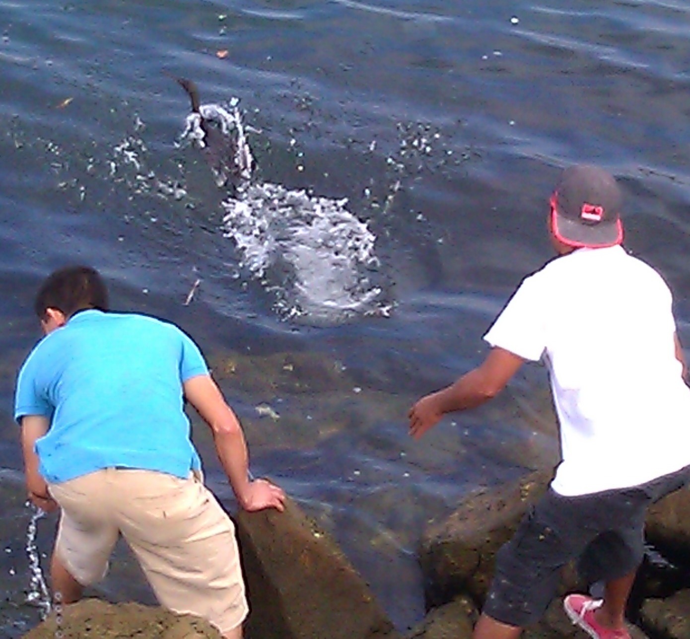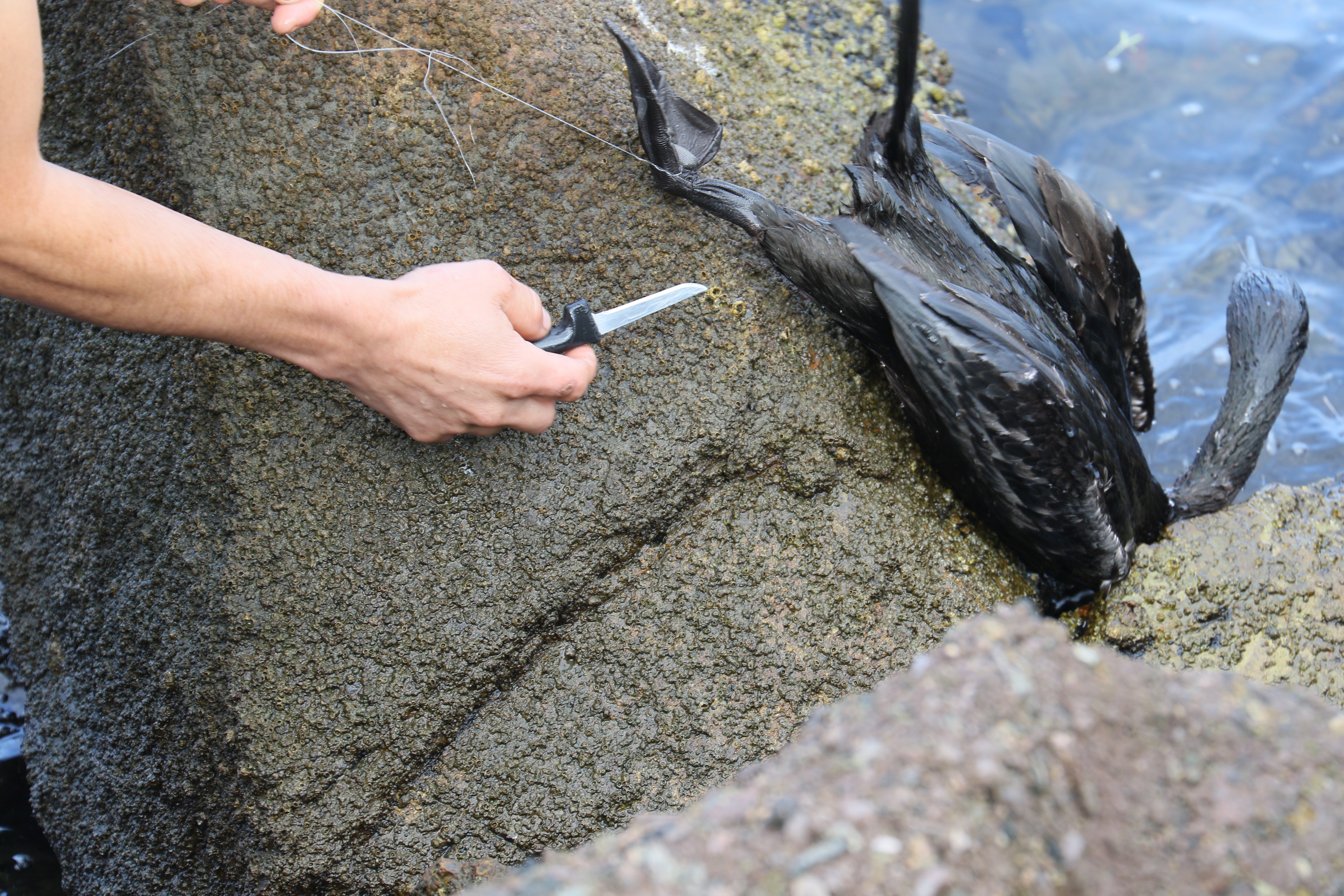 Our main effort was on the 15th and we were rewarded with some fine birding, both on Ballona and at the freshwater marsh across from Playa Vista. As we walked out on the jetty between the creek and the marina channel, we were hailed by an outraged nature-lover who had just witnessed fishermen harassing a bird. A few moments later we were rewarded by the opposite: a couple of fishermen making a valiant and successful effort to free a Brandt’s Cormorant from another’s fishing line that had tangled the cormorant’s foot and trapped him, not far from shore. (photos by Randy Ehler and Grace Murayama).