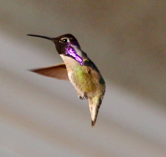 The gorget of the male Costa’s Hummingbird is purple with long side ‘extensions’ (J. Waterman 2/7/15)