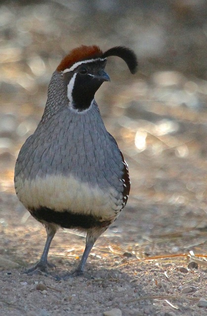 We found some of our target birds at the Wister Unit parking lot: Gambel’s Quail, Verdin, Abert’s Towhee and the only Inca Doves of the trip. An immense amount of brush as well as the nature trail is gone from the west side of Davis Rd. for reasons we couldn’t guess, leaving a barren moonscape. A stop at the old salt works spa produced our first Burrowing Owl sitting on a concrete box-like affair, while a short distance away we found a large mixed flock of Rough-winged, Tree, Barn and Cliff Swallows resting on overhead wires and poking about in a muddy field. Many of the Tree Swallows were blindingly iridescent blue.