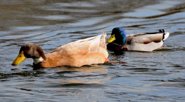 Our white domestic ducks are all mallards, modified by human selective breeding for size and white plumage. They and the regular wild Mallards do not recognize these differences as significant, and they freely interbreed. You can get many variations as the genes for white plumage mix with the genes for typical Mallard plumage. In the bird above, bill and leg color and the partial white neck ring is about all that’s left of the ancestral plumage displayed by the wild male Mallard behind it. Even the little tail curl which all male Mallards have is almost absent.