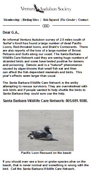 Common Murre beaches itself at Zuma, perhaps due to domoic acid poisoning (G. Murayama 4-19-17)