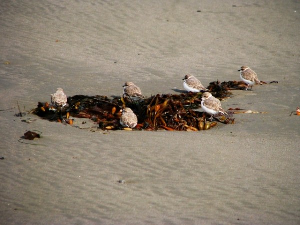 Six Snowy Plovers surround beach wrack (C. Almdale 12/23/12)