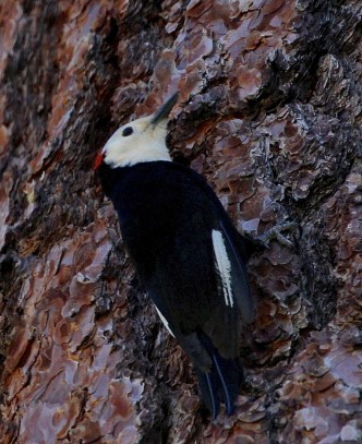 past the parking lot at the top of the road. Fox Sparrows and Green-tailed Towhees both sang as we searched in vain the numerous patches of flowering currant bush for Calliope Hummingbird. The Fox and Green-tailed are both excellent – and annoyingly similar – singers, with burblely varied songs, and we never get tired of hearing them. At lunchtime under the pines, we heard a rapid drumming in the distance, which proved to be a male White-headed Woodpecker banging on a dead tree.
