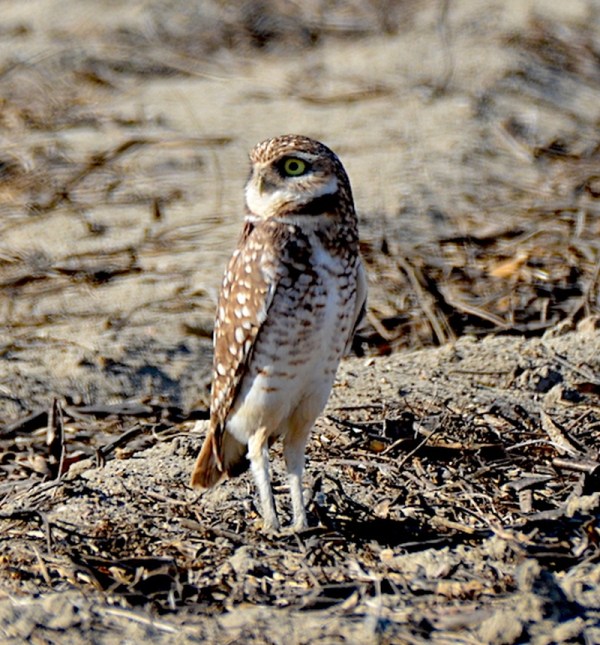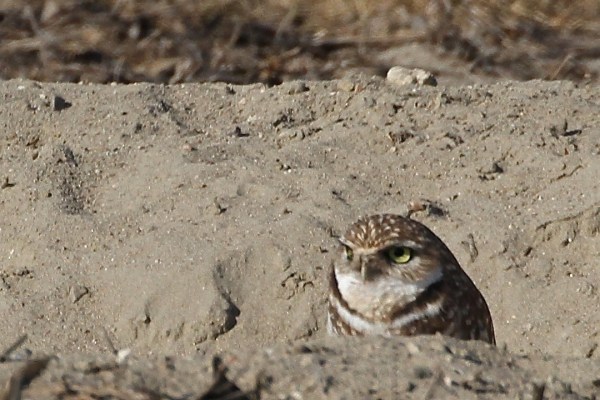 Burrowing Owl crouches in his tiny bomb crater (Joyce Waterman 11-18-17)