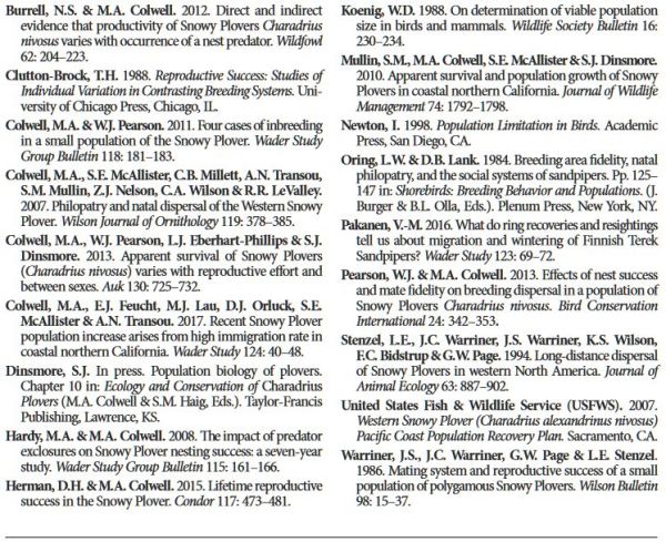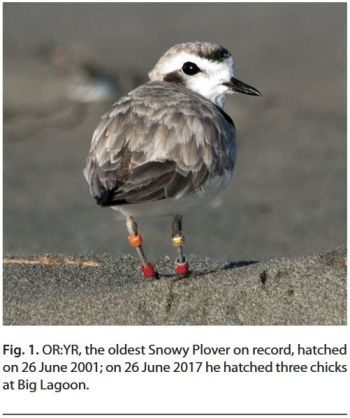 Ornithologists and conservationists are well aware of the valuable insights provided by long-term studies of populations of individually marked animals (Clutton-Brock 1988, Newton 1998). In particular, estimates of survivorship and reproductive success derived from annual records of uniquely marked birds inform management practices that attempt to increase population size, which is especially important for threatened and endangered taxa (e.g., Pakanen 2016). Recently, we summarized population growth (Colwell et al. 2017), lifetime reproductive success (Herman & Colwell 2015), and annual variation in survivorship (Mullin et al. 2010, Colwell et al. 2013) for the Snowy Plover Charadrius nivosus. Here, we submit observations of a male Snowy Plover (Fig. 1) who, at 16 years of age, continues to offer insight into the conservation challenges faced by the species.