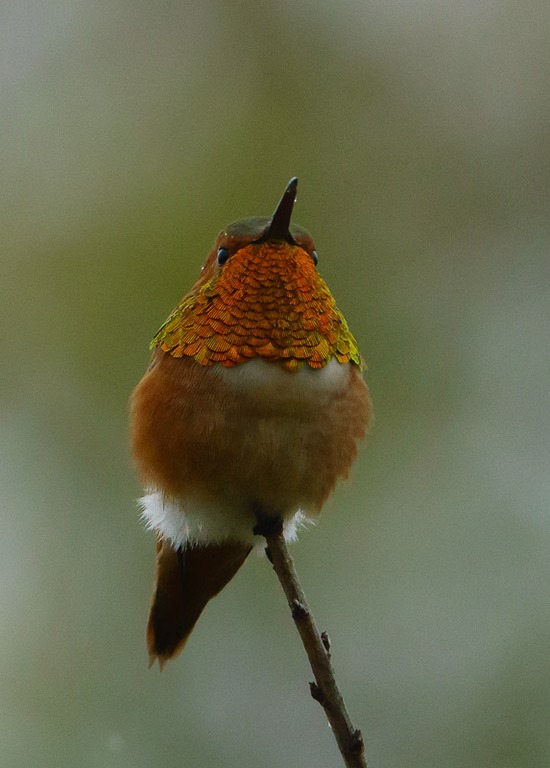 We all know that when we watch hummingbirds while the sun is out the colors come and go as the bird turns, or as we move to different angles. This is because hummingbird colors are almost always iridescent – meaning they refract light like a prism. The feathers themselves have black pigments but are structured in different ways to refract different colors. It’s all a trick of the light and the intensity of the color depends on the angle and intensity of the light source. When you get the male Allen’s Hummingbird in bright sunlight and at the right angle, the throat can look like it’s on fire. The photo above was taken on a very cloudy day. In fact, you can see tiny raindrops on the bill and head. You can also see the entire gorget (throat feathers) in color. But there’s no sun, you say. How is this possible?