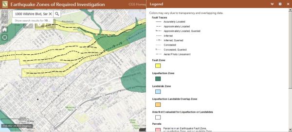 The screen shot below is based on the address 1000 Wilshire Blvd., the small dark dot in lower left of picture. Green areas are liquefaction, yellow are fault zones, broken lines are approximately located faults. Right half of the screen is the legend, which disappears with a button click to leave a full-screen map. Map includes all of California.