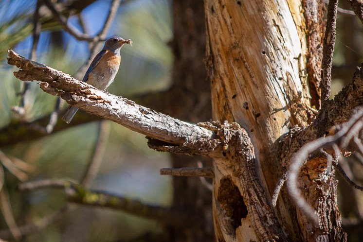 Western Bluebird male with food above nest hole, Mt. Piños (Dan Seidner 6-9-18)