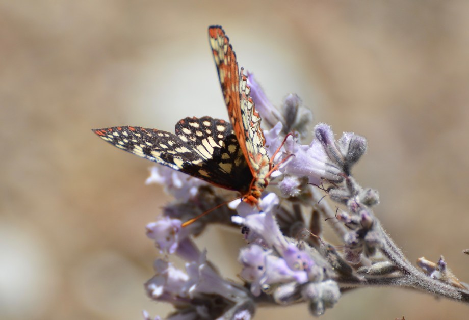 Variable or Chalcedon Checkerspot male, Euphydryas chalcedona, male, flower probably Eriodictyon crassifolia, Mt. Piños (Grace Murayama 6-9-18)