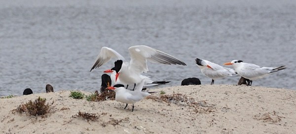 Mating Caspian Terns, Royal Tern on far right (G. Murayama 6-22-18)