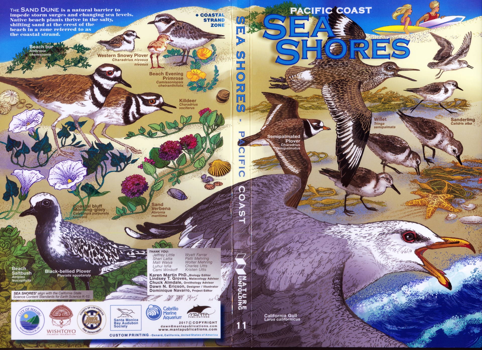 Each Junior Lifeguard also received a free copy of the Pacific Coast SEA SHORES science guide, created by Dawn Ericson of Manta Publications. Professor Martin wrote the text for the science guide. Our Santa Monica Bay Audubon Society contributed funding for this project and helped with the ornithological aspects. The science guide is a high-quality eight-page laminate which can be used in the field, and discusses birds, fish, invertebrates, kelp, tides and ecological zones.