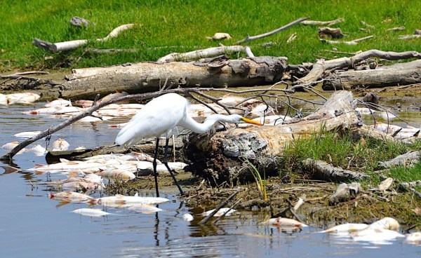 The white dots are dead Striped Mullet; view of the Malibu Lagoon west end channel. (Lu Plauzoles 8-26-18)