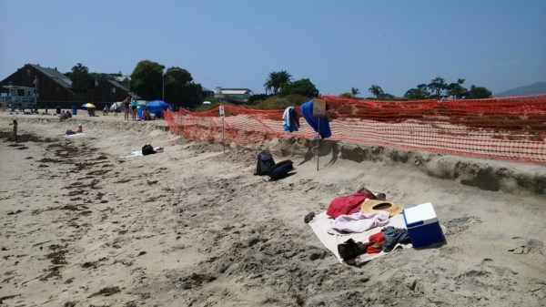 The recent surf and high tides had considerably eroded the beach, leaving a 3-foot berm drop-off in the sand, and the Snowy Plover enclosure fence is close to falling over. Beach walkers, who have been excellent at staying out of the enclosure until now, were beginning to enter the enclosure due to the complete lack of beach at high tide outside the fence.