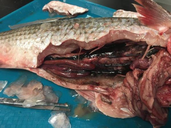 Mullet necropsy, typical Malibu Lagoon 19-inch fish, nothing negative discovered (Karina Johnston, Bay Foundation – 8-24-18)