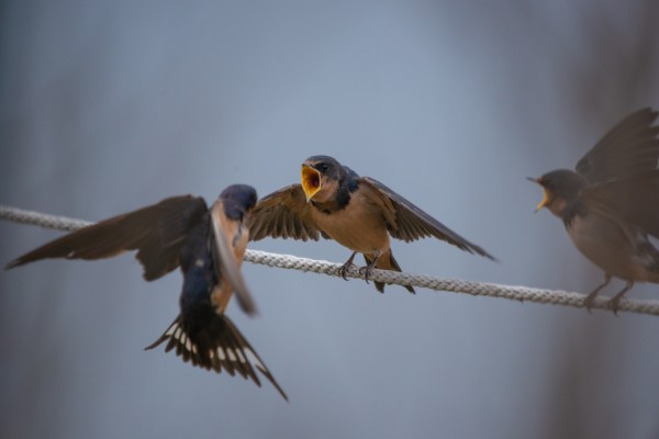 Barn Swallows have been breeding at the lagoon for many years. After the young have left the nest, they line up on a leaning reed stem, or in this case a cable, and wait to be fed. Mmmmm, bugs!