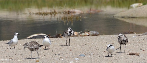 We had a good assortment of terns: no Least, but Caspian, Royal, Elegant and a few Forster’s were present. Good numbers of Whimbrel and Black-bellied Plovers rested on the sand in all stages of molting. Snowy Plovers numbered 33, but no banded birds were spotted.