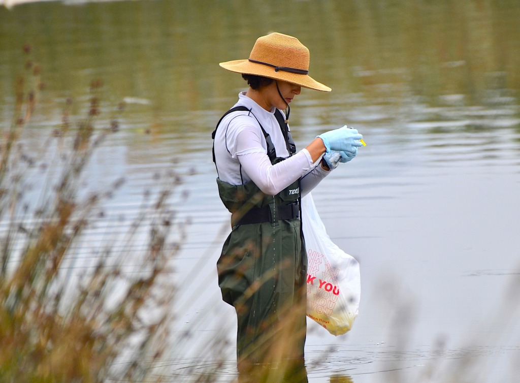 By Friday 8/24, the dead were estimated at 2000-3000 fish, throughout the lagoon and channel and well up Malibu Creek. On Sunday 8/26, bird walk day, the dead mullet probably approached 4000; many were in the 18-19” length (see photo below), but some were as large as 36”, stunning some biologists. Small dead Silverside fish were found of genus Menidia or Atherinops. A pale waxy/oily substance lay on the water surface (see photo above) around the fish which was later determined to be an lipid exudation from the decomposing fish. Our Sunday birding group saw a few mullet swimming sluggishly at the surface. Dead fish were stinking in the hot sun. Because very few scavengers came to eat the dead fish, State Parks personnel began removing them on Monday 8/27.