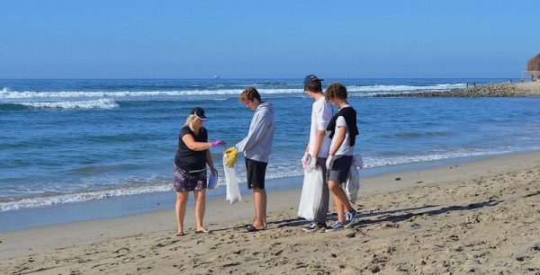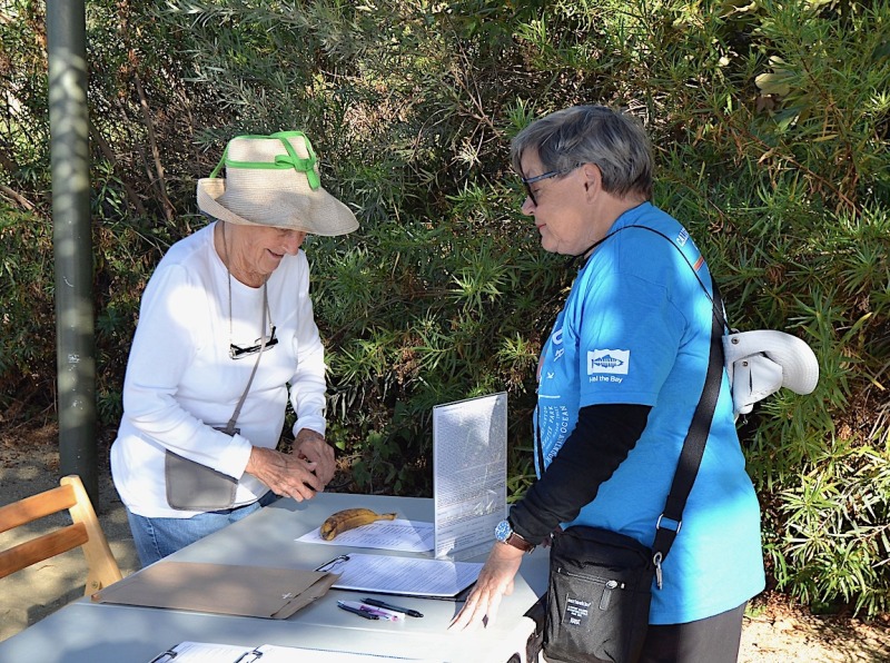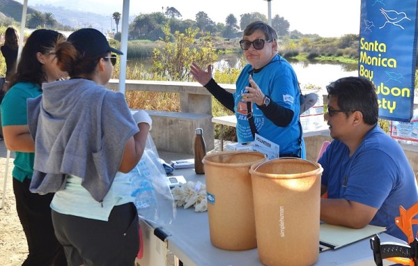 168 people showed up, signed in and spread out from beach to lagoon and up the creek. True, total pre-sign-ups were a bit over 300, but this is slightly better than last year, when 300 signed up and 157 showed up. Eleven SMBAS worker bees appeared, setting up tables & shade awning, greeting, taking signed waivers, giving safety talks, handing out bags and gloves, then weighing-in the returning trash and giving water to thirsty picker-uppers.