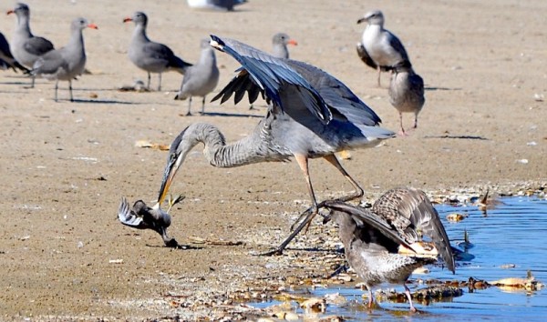 Meanwhile, down on the lagoon edge, a Great Blue Heron picks off an unwary Eared Grebe. (L. Loeher 9-15-18)