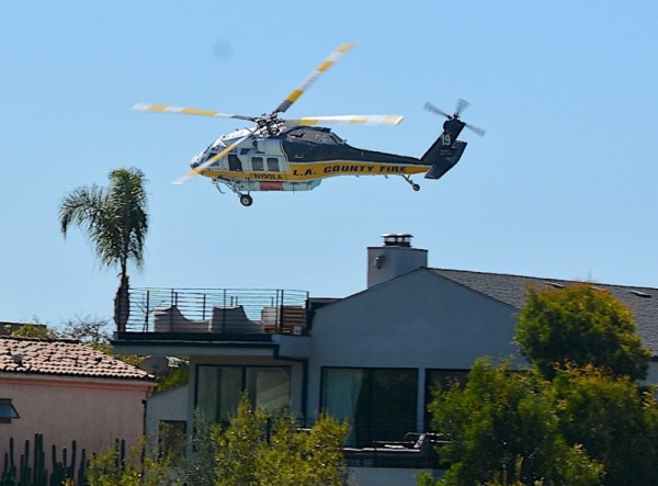 An L.A. County fire helicopter is really gettin’ down; I wouldn’t want to be on that rooftop patio just then. (L. Loeher 9-15-18)