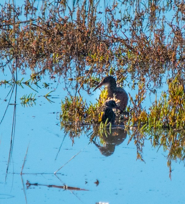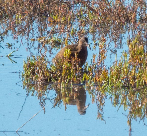 Finally we spotted a rail. Then another. The birds were in the general direction of the sun so colors and patterns were difficult to discern, but through repositioning ourselves and careful observation, we determined they were Ridgway’s Rail (Rallus obsoletus), formerly classified as Clapper Rail (R. longirostris).