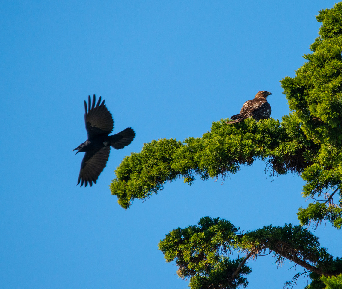 Our local crows strove mightily to drive off the Red-tailed Hawks (Ray Juncosa 2-24-19)