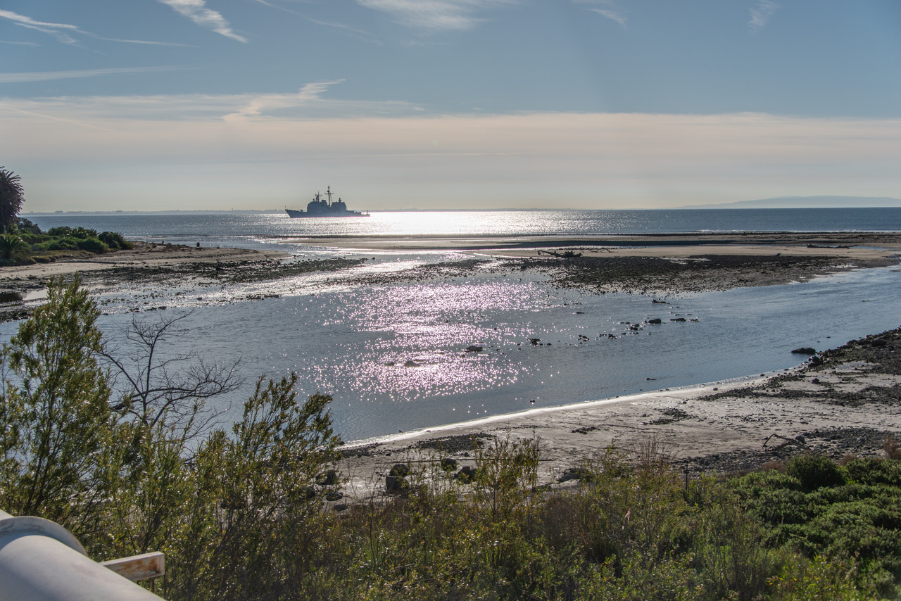 Lagoon outlet with Guided Missile Cruiser USS Lake Champlain in the bay (Ray Juncosa 2-24-19)