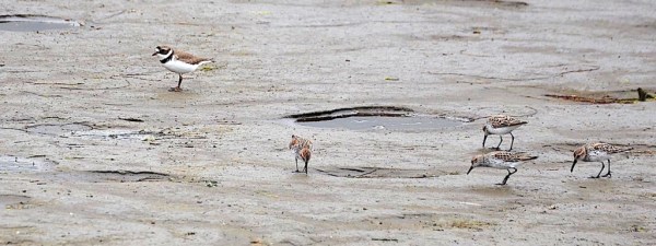 Semipalmated Plover and Western Sandpipers (G. Murayama 4-28-19 Malibu Lagoon) Both species have partial webbing on their toes, enabling them to walk easily in soft mud, yet avoid clumsy waddling like the fully-webbed duck.