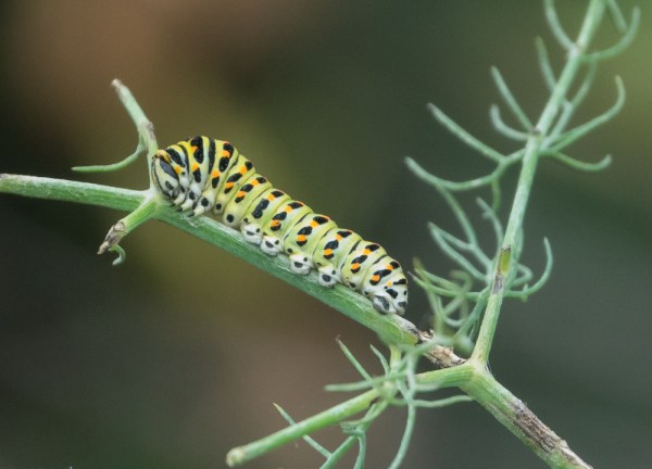 A trailside caterpillar, most likely an Anise Swallowtail (C. Bragg 6-23-19)