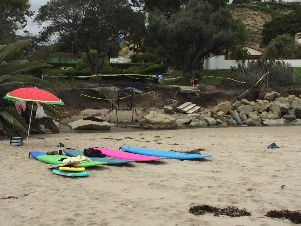 Water in the lagoon and channel was moderately high, typical for June, although no so high as to flood our summer-clock sidewalk (see lead photo). The outlet was almost closed, and the outflow was ankle-deep in spots, easy to wade. When the beach was breached by creek flows during the winter rains, the opening was mid-way across the beach. Now it’s as far east as it can possibly be, farther east than anytime in at least the past forty years. This is easy to calculate, as the rushing waters ate away at the Adamson House property edge, carrying away part of the fence and causing a large palm to fall and their small “changing room” structure to collapse.
