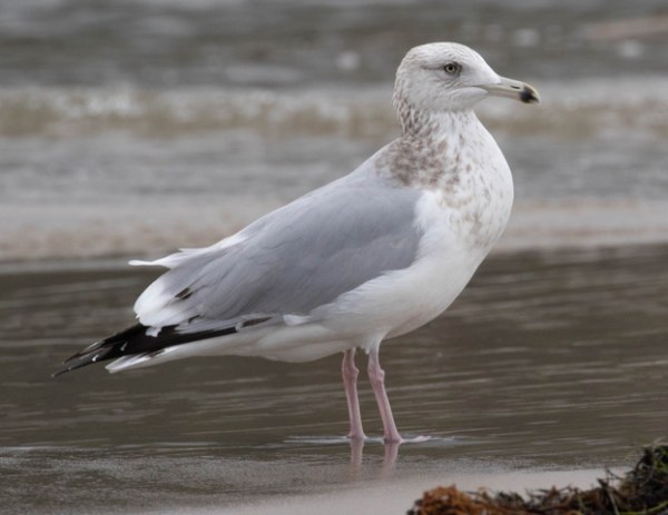 Herring Gulls are common winter visitors at the lagoon, but always in very low numbers (out of 60 total visits, 42 were of single birds). They are the size of a Western Gull (25″ long) with similar pink legs, dark wing tips, white tail, pale eye, and large yellow bill with a single red spot, or a darkish tip as in this bird. But the head and neck are streaked and the mantle is pale gray like that of a California Gull (compare to the Western Gull in lead photo). On the east coast they are far more abundant and are literally trash birds, as they now utilize human dumps as a major source of food.