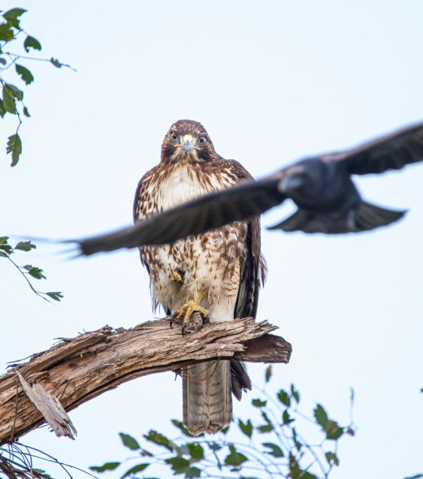 Young Red-tailed Hawk keeps his eyes on an annoying crow