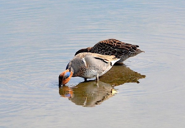 The male of this Green-winged Teal pair has an iridescent green eye patch