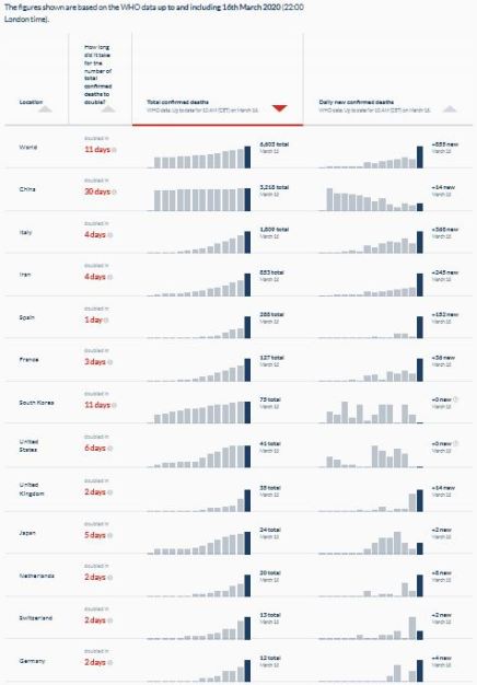 The table below also shows how the total number of confirmed deaths, and the number of daily new confirmed deaths has changed over the last 14 days. China seems to be dropping. On-line you can sort the table by any of the columns by clicking on the column header.
