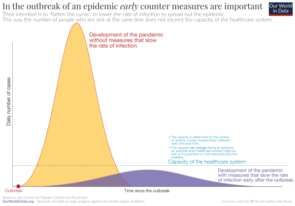 Early counter-measures are important in an epidemic. Their intention is to lower the rate of infection so that the epidemic is spread out over time such that the peak demand on the healthcare system is lower.