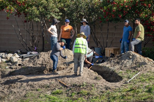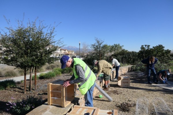 Southern California Edison volunteers brought and operated a mini-excavator to dig most of the trenches. The excavator crew finished their work by early afternoon and teams of volunteers began covering the boxes and tubing with poultry netting and hand filling the trenches.