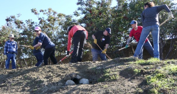 The mini-excavator could not handle the very steep slope at the last installation site, so a crew of 10 volunteers hand dug those trenches in hard, compacted soil. After a day and half of hard work with shovels and pickaxes, the hand-dug trenches were finished, and the burrows and tubing were installed.