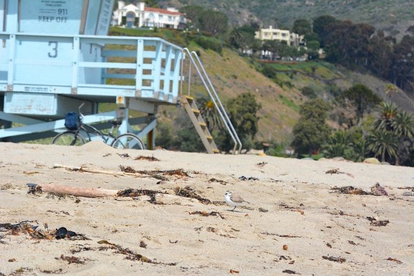 A lonely Snowy Plover by the westernmost lifeguard station on the beach