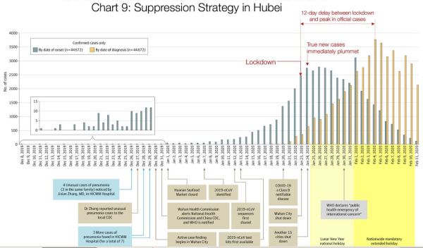 Above chart 9: Chinese authorities were able to determine, through after-the-fact interviews, just when actual cases (blue-gray bars) began, as opposed to known cases (orange bars). Actual cases began to drop within two days after lockdown, but known cases continued to rise.