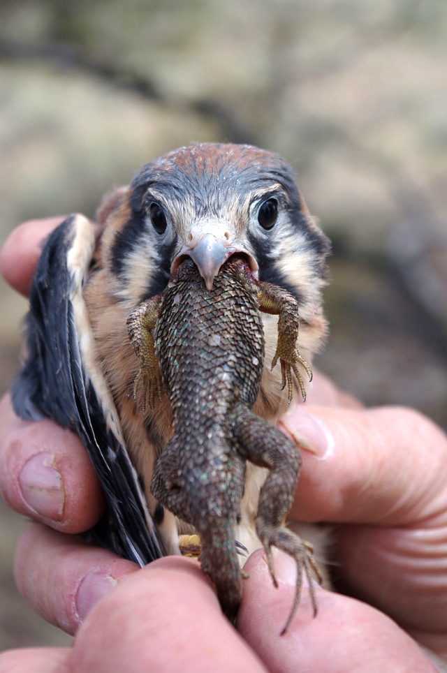 We have documented some of the rather amazing eating habits of nestling Kestrels. One photo, taken in Wisconsin in 2005, shows an approximately 18-day old female slooowly devouring a snake. Another photo shows a little glutton on the Crooked River Ranch, who was being retrieved for banding from its nestbox by volunteer Marilynne Keyser. Several photos show close-ups of the bird as it devours a western fence lizard. It’s too bad that we didn’t have the time to check on the progress of the nestling/lizard situation a day or two later.