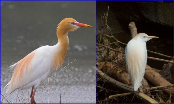 Right: Western Cattle Egret – B. ibis (HoodedWarbler12) Both: Wikipedia