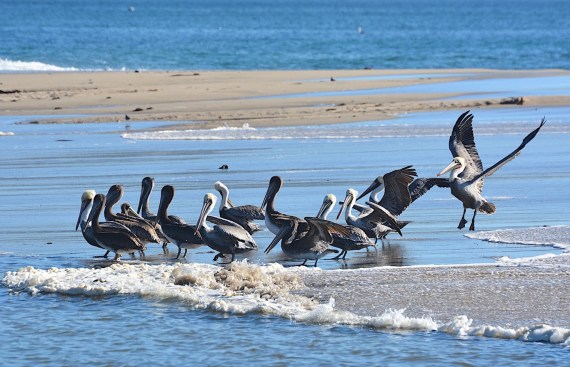These Brown Pelicans “were bothered at each little wash-up of washover-surf”